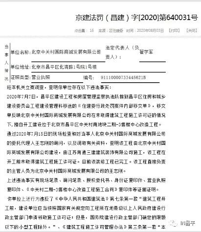行政处罚决定书指出,2020年7月15日,通过现场检查和对当事人中关村国际商城的委托代理人王某的询问,以及调取有关资料,查明该工程由中关村国际商城建设,由江苏南通三建建筑装饰有限公司施工,该工程在开工前未取得建筑工程施工许可证。目前该装修工程已完工。该工程直接负责的主管人员为中关村国际商城的王某。