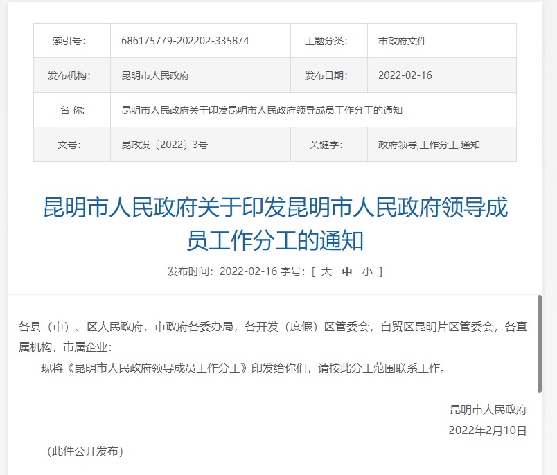 掌上春城讯2月16日,昆明市人民政府网站发布《昆明市人民政府关于印发昆明市人民政府领导成员工作分工的通知》,公布昆明市人民政府领导成员工作分工情况。详情如下: